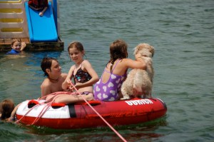 I think this photo says it all. Farley spends his days in the summer in the lake with the kids. Lots of excitement, exercise, and fun.